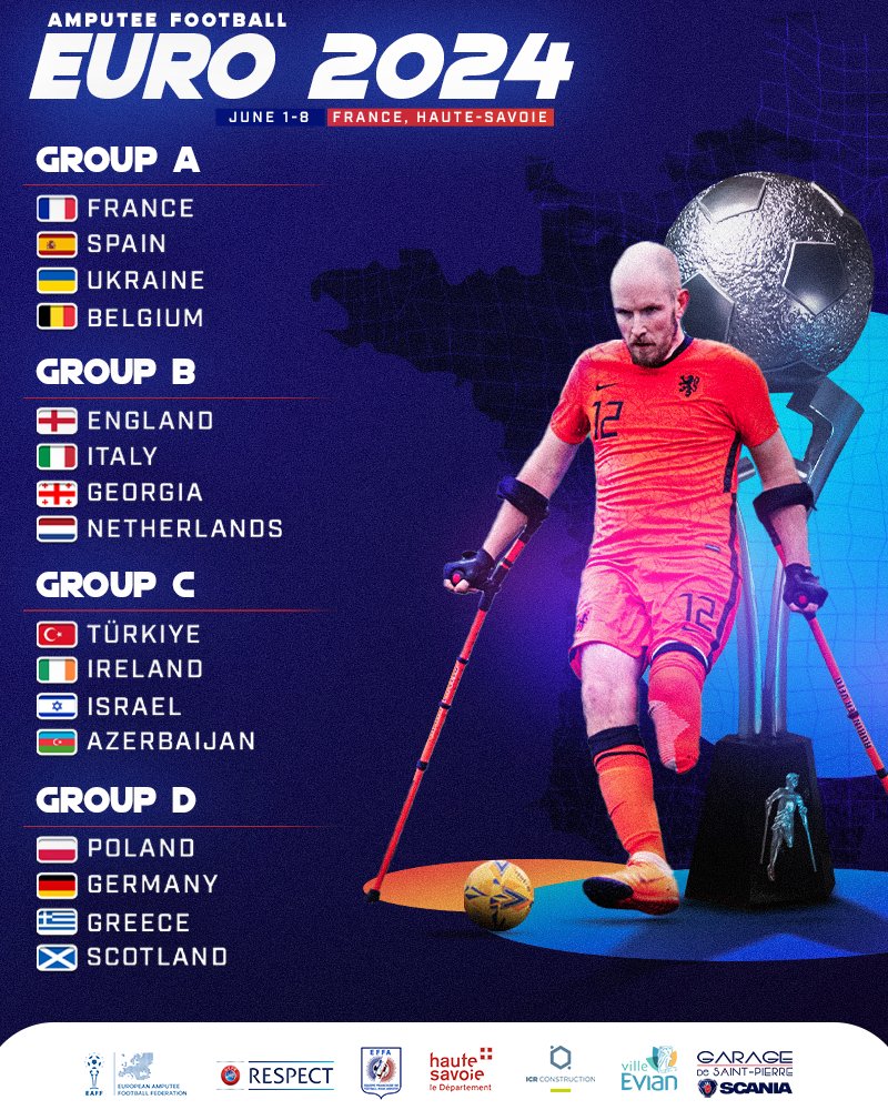 Fransa’nın Evian kentinde gerçekleştirilen Avrupa Ampute Futbol Şampiyonası kura çekimi sonucunda Türkiye, İrlanda, Azerbaycan ve İsrail aynı grupta yer alacaktır. Şampiyona 1 Haziran 2024 tarihinde başlayacaktır.