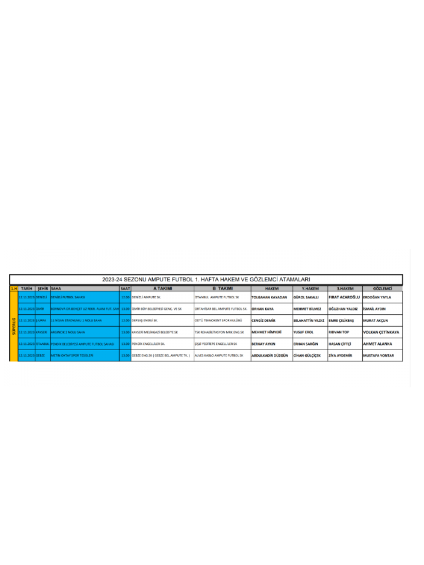 Türkiye Bedensel Engelliler Spor Federasyonu 2023-2024 faaliyet programı çerçevesinde oynanan “Bitexen Ampute Futbol Süper Ligi” 1. Hafta Hakem ve gözlemci atamaları aşağıdadır; 1. HAFTA SÜPER LİG HAKEM GÖZLEMCİ ATAMALARI